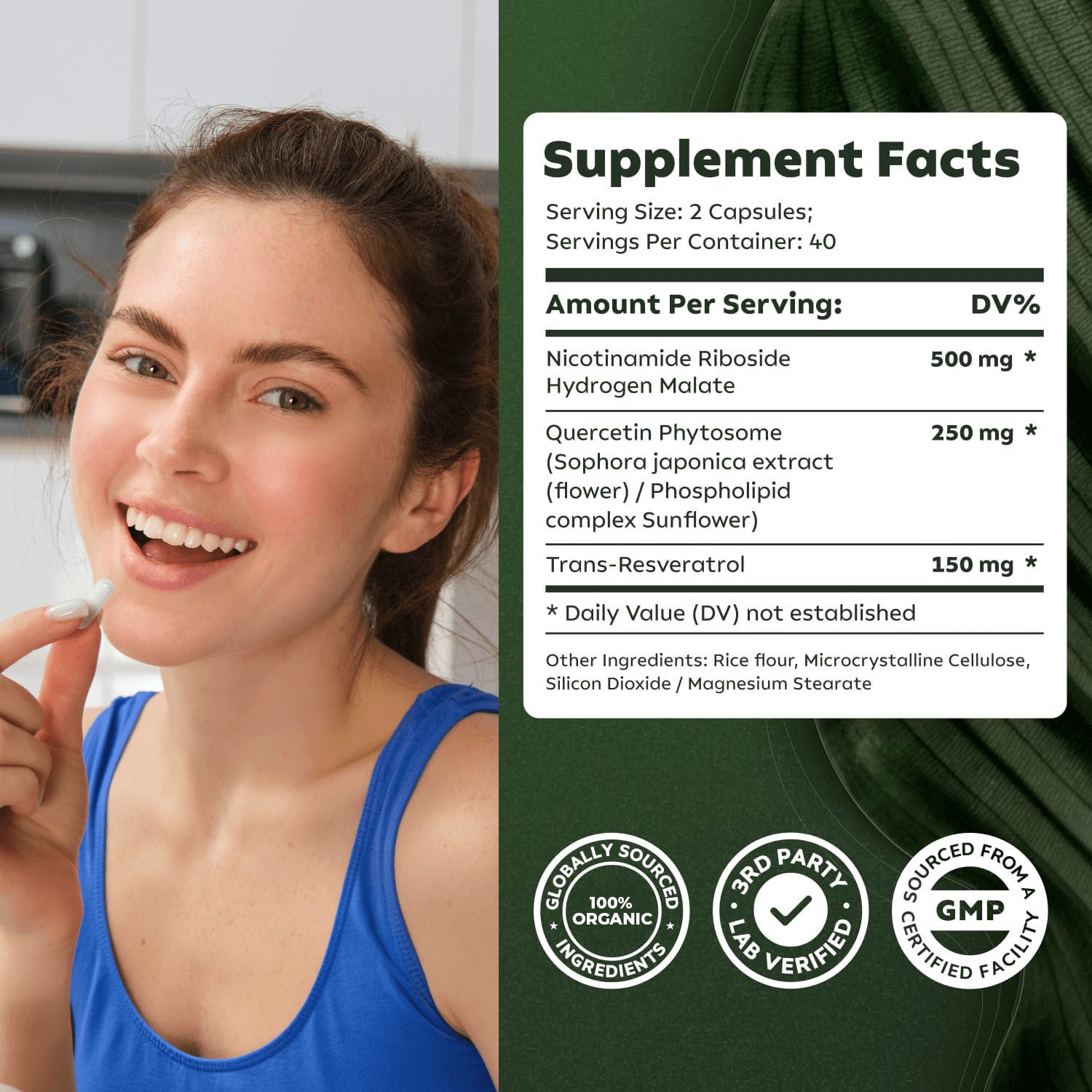- Boosts NAD+ levels for natural energy, cellular repair, and longevity