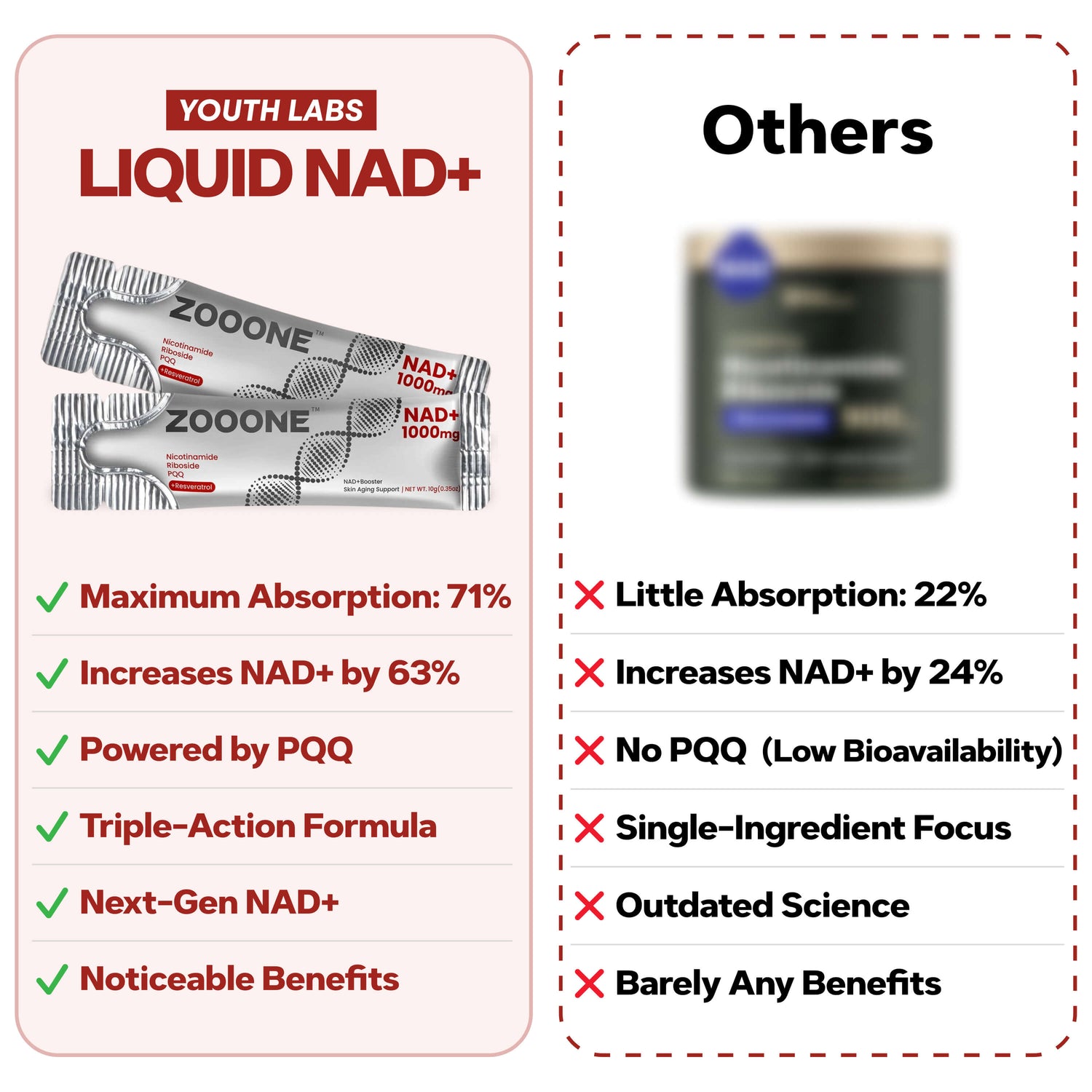 Forget about scary toxic pills without clear origin and materials. Liquid form of NAD+ booster is fully absorbable. It's the safest supplement on the market with 0 side effects reported so far.